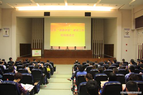道德讲堂建设,是中央文明办部署的一项重点工作,目前,市区已有200多个市级以上文明单位建设了道德讲堂。今后,市文明办每月将推荐一个优秀道德讲堂活动,在市道德讲堂总堂进行公开展示。会上,戴祝水指出,要进一步提高标准,规范流程,将“道德讲堂”建设纳入文明创建考核指标,加快道德讲堂建设步伐。要抓好道德讲堂队伍建设,丰富道德讲堂宣讲内容,完善道德讲堂工作机制,确保道德讲堂建设成效。要积极打造具有鲜明温州特色的“机关企事业单位、窗口服务行业、民营企业、学校、社区、村镇”等“六类道德讲堂”。