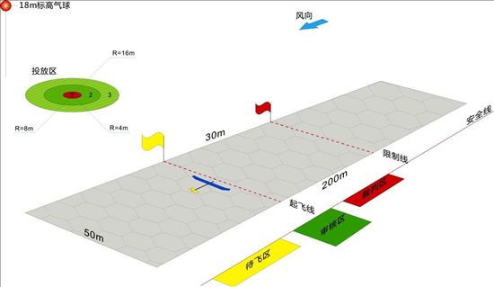 5.5模型离地即为正式飞行,每组运动员一轮只允许进行一次正式飞行。5.6空投高度不得低于18m长系留绳所系气球的高度,空投时模型航向必须与起飞航向夹角在45度以内。
