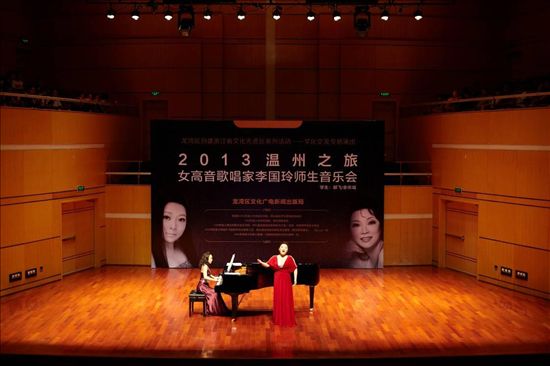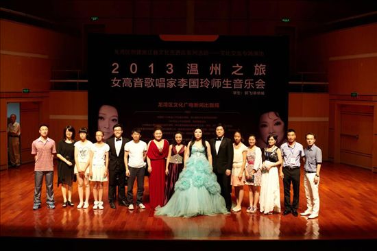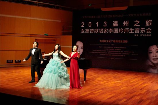 6月22日晚,温州大剧院音乐厅灯火辉煌,座无虚席,一场由龙湾区文广新局主办的2013温州之旅女高音歌唱家李国玲师生音乐会在此举行,这是龙湾区创建省级文化先进区系列活动的首场文化交流演出。当晚,李国玲及其学生向观众呈现了一出浓情演绎与音乐享受交相辉映的视听盛宴。