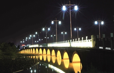 南仙桥上的亮丽工程成为三垟大道上一道靓丽的夜景。 (陈翔 摄)