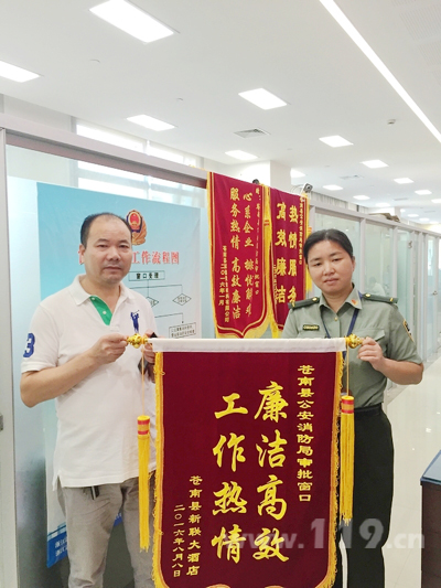 自“创满意”工作开展以来,苍南县公安消防局不断强化服务意识,提升服务水平,为企业、群众开展优质、高效、热情的服务。8月8日,苍南县新联大酒店负责人带着一面印有“廉洁高效工作热情”的锦旗赠送给苍南县公安消防局行政审批窗口工作人员手中表示感谢。