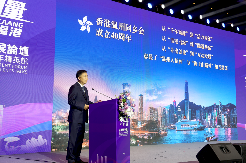 在致辞中,张振丰代表家乡党委政府向广大旅港乡亲致以诚挚问候。他说,从“千年商港”到“活力香江”,香港温州同乡会成立40年来,团结带领广大旅港乡亲书写了“温州人精神”与“狮子山精神”相互激荡的传奇故事。温州始终牢记习近平主席寄予“续写创新史”的殷殷嘱托,正加快迈向“双万”城市、提速打造“浙江第三极”。希望两地青年争当融入大局的弄潮儿、创新发展的引领者、两地情谊的传播者,积极投身长三角和粤港澳大湾区联动发展热潮,聚焦科技前沿领域,打造协同创新生态,深化经贸人文交流,书写温港联动新篇章。