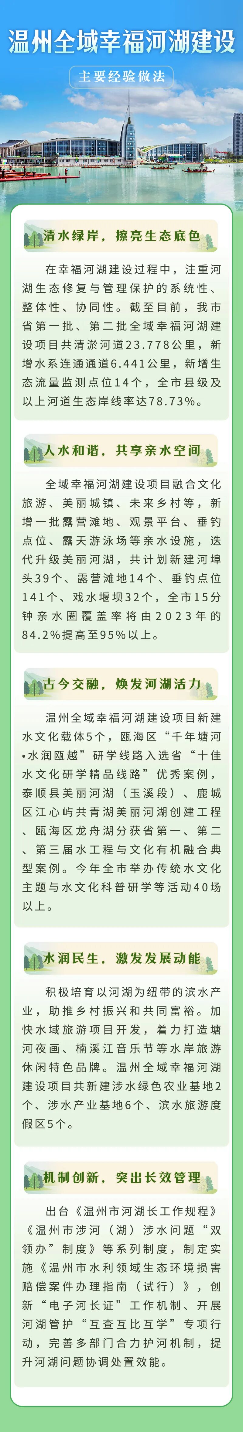 自2023年开始,温州市进入全域建设幸福河湖的新征程,“幸福河湖”的重点关注点从河湖面貌变化向百姓的获得感、幸福感升级,初步形成人水和谐、全域水美、共享幸福的河湖环境。2023年以来,新增水上碧道431公里、滨水户外运动场所22个、城乡亲水节点216个、高品质水美乡村133个、高品质共富亲水IP103个。平阳县鳌江成功入选国家水利风景区,鹿城区汇昌河获评省“最美家乡河”,温瑞塘河、瑞平塘河、戍浦江、永强塘河、飞云湖、仕阳溪等6条河湖入选省“幸福母亲河”优秀案例。10个县(市、区)分三批次入选省全域幸福河湖建设项目(全省共44个),入选数量居全省首位。