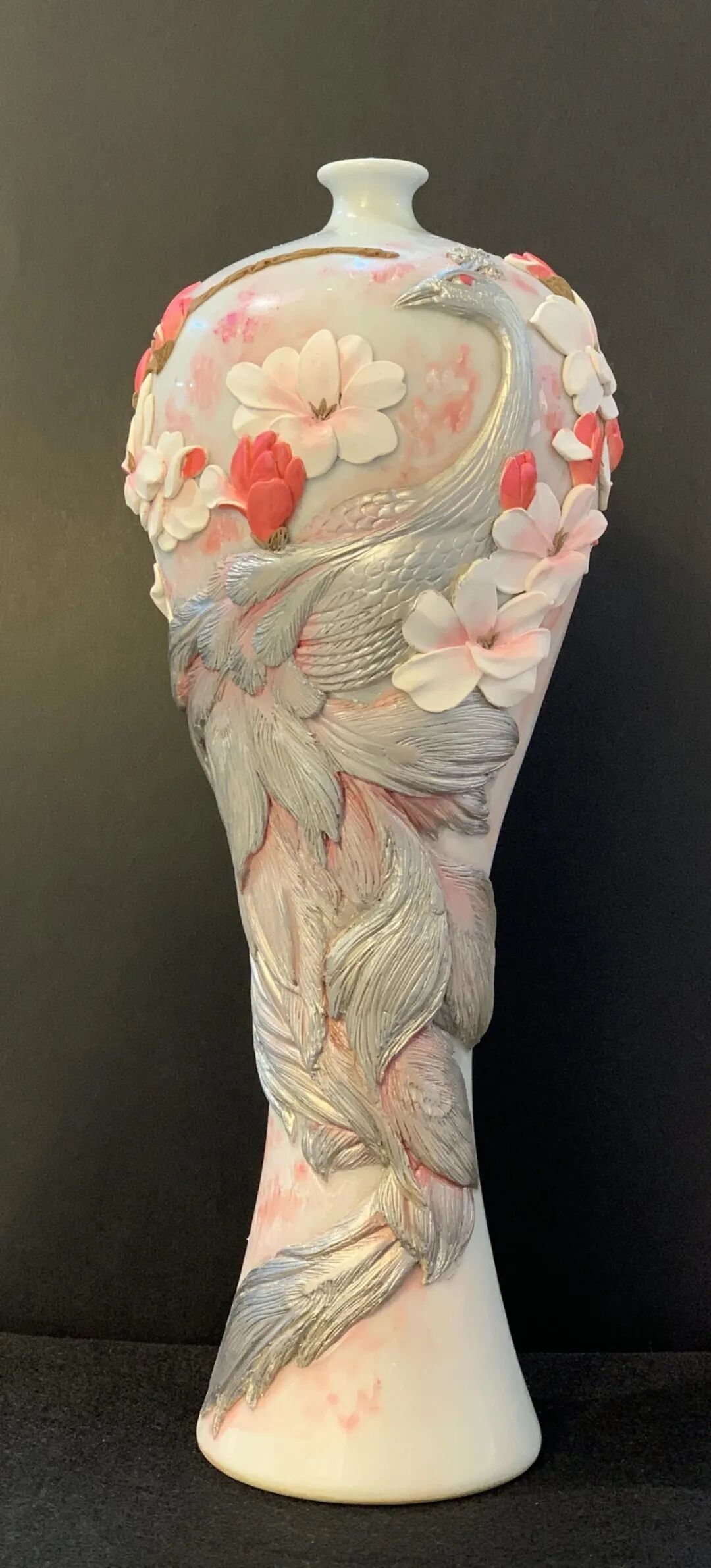 该作品以白瓷美人瓶为基底,巧妙融合瓯塑的油泥堆塑、描银及霓彩点触等工艺,使立体塑纹与温润瓷釉交相辉映,是传统技艺与现代审美碰撞的结晶。作品捕捉江南春日的灵动一瞬:晨雾朦胧中孔雀舒展羽翼,玉兰悄然绽放,宛如一幅凝固的瓯江春景图。