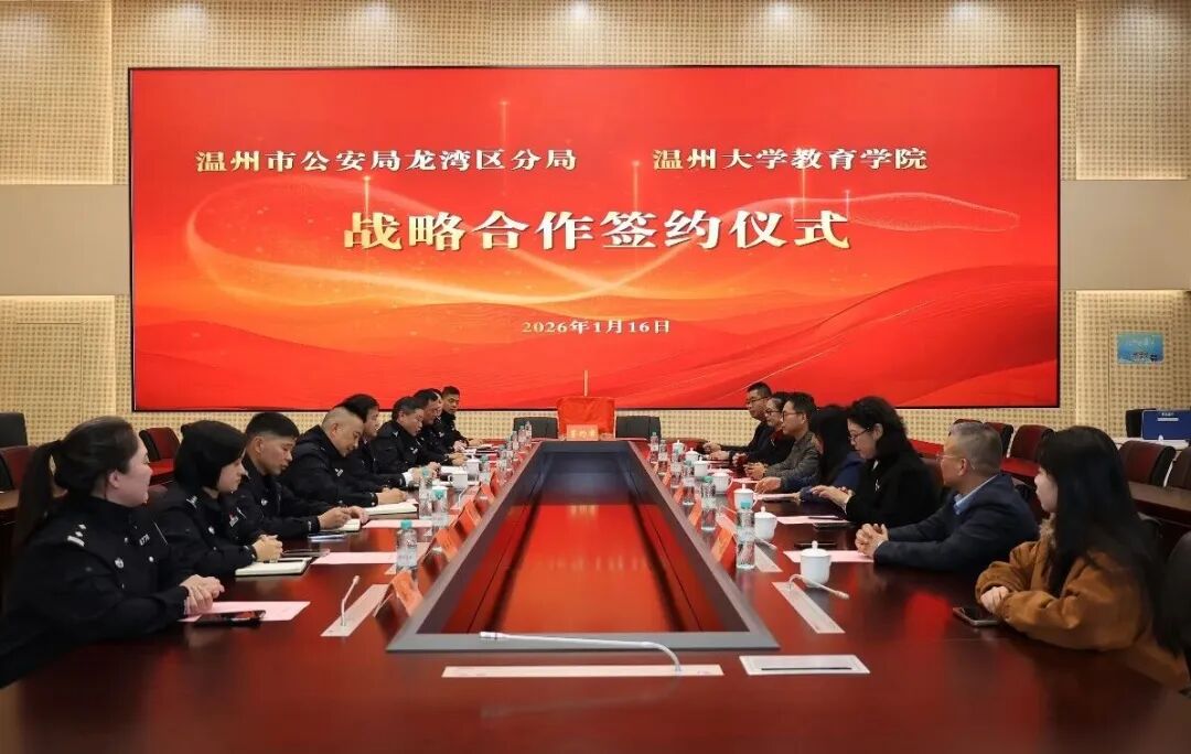 1月16日,温州市公安局龙湾区分局与温州大学教育学院战略合作框架协议签约仪式在龙湾公安分局举行。龙湾区副区长、公安分局党委书记、局长叶辉,温州大学教育学院院长李长吉出席仪式并讲话,双方相关领导及代表共同见证此次合作。