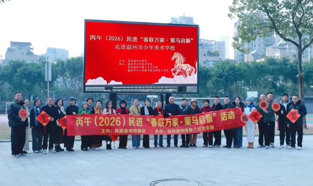 新春将至,墨香满园。为推动传统文化与美育教育深度交融,营造欢乐的新春氛围,2月12日,由民进温州市委会主办,民进第三文艺支部、市政协中小学教育委员工作室承办的丙午(2026)民进“春联万家·策马启新”活动在温州市少年美术学校举行。