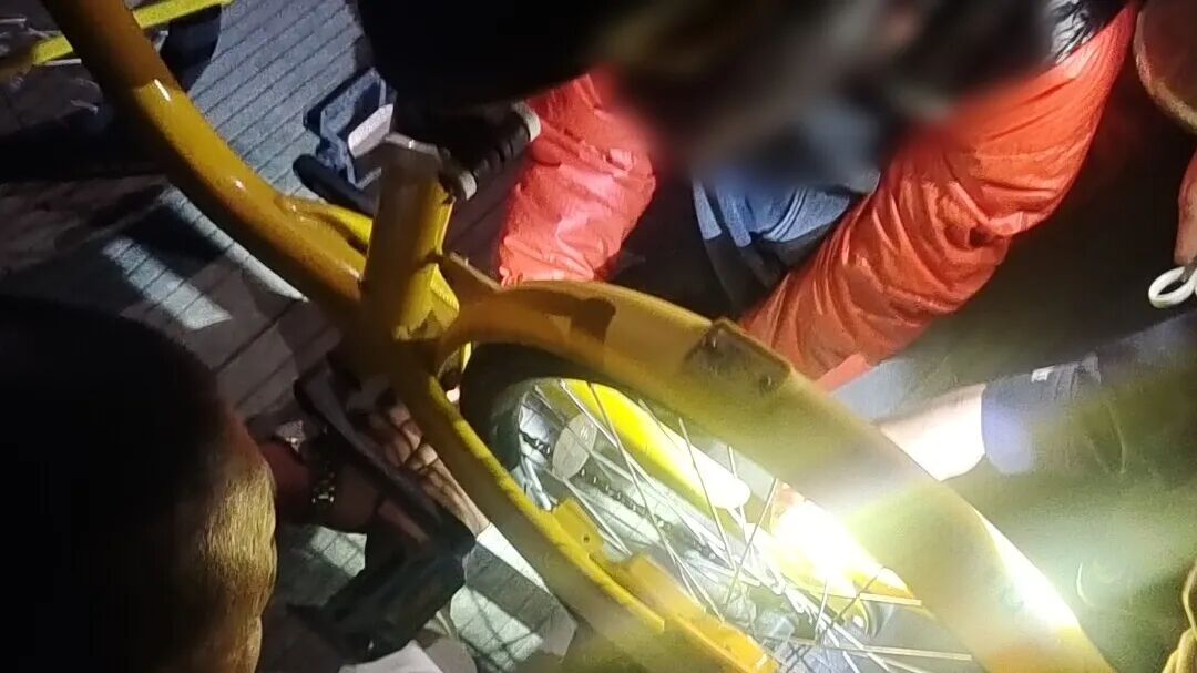 将手伸进了共享单车链条里