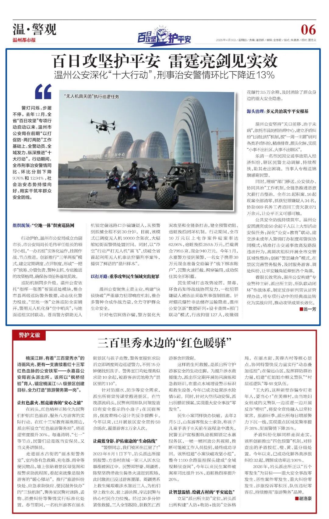 巡防机制同步升级。温州公安依托“指挥一张图”智慧巡处模块,整合市县两级巡防警务数据,动态优化警力投放。“空地一体”立体巡防全面铺开,警用无人机化身“空中哨兵”,与地面巡组实时联动。苍南警方借助无人机锁定偏远路口诈骗嫌疑人,从预警到抓捕全程不到30分钟。目前,该模式已调度无人机10000余架次,大幅缩短街面警情处置时间。同时,以“净空”行动严打无人机“黑飞”,侦破全省首起利用无人机非法狩猎刑事案件,提供了鲜活的“温州样本”。